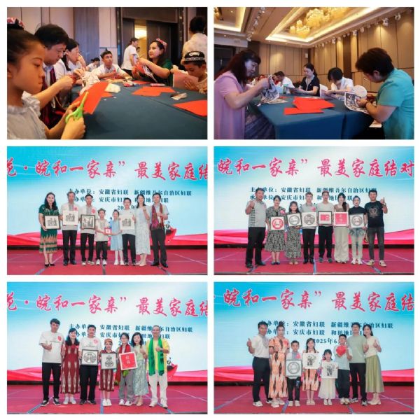 每对结亲的家庭共同组建成一个个团队,只见他们巧手翻飞,互帮互助,“你们平时喜欢做什么?”“新疆有哪些好吃的?”“欢迎多来安庆做客!”……他们一边饶有兴致地交流着生活趣事,一边交流着剪纸技巧,心与心的距离也悄然拉近,一张张红纸变成吉祥的图案。