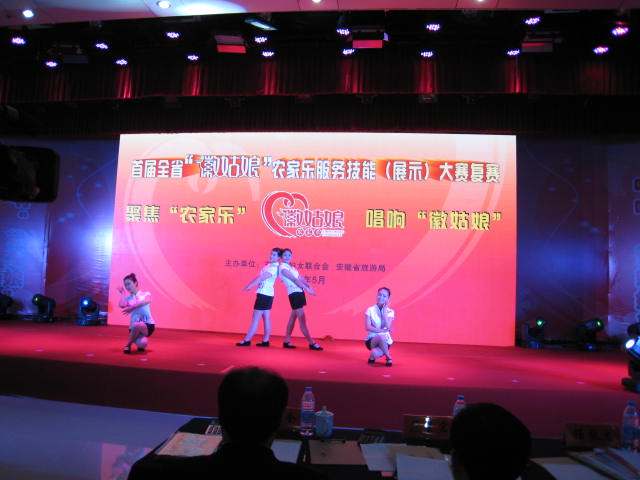 5月28日,由省妇联、省旅游局共同举办的首届全省 “徽姑娘”农家乐服务技能(展示)大赛复赛开赛,来自16个地市的代表队现场竞技,角逐6个决赛名额。安庆市金梦湾“徽姑娘”农家乐代表队的4名女队员经过闪亮登场、美丽农家、中餐主题设计、特色菜肴、知识问答、才艺展示和农事比拼等7个比赛环节的角逐,脱颖而出,获得第6名好成绩,进入决赛。