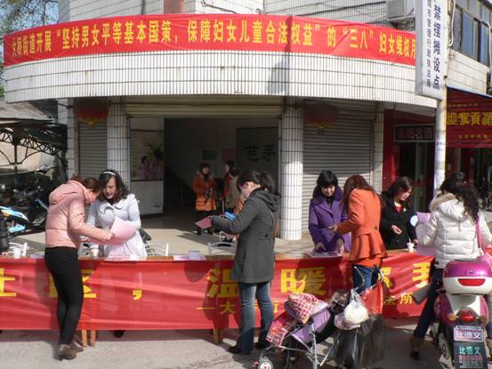 今年3月14日,大桥街道妇联、司法所、计生办联合在芭茅巷社区开展了“坚持男女平等、保障妇女儿童合法权益”为主题的“三八”维权月宣传活动。活动中,发放了《安庆市关于预防和制止家庭暴力的若干意见(节选)》、《中华人民共和国妇女权益保障法(节选)》、《婚姻法》、《公民常用法律法规知识问答》、《计划生育法律法规摘要须知》等材料近千份,接受妇女咨询近500人次。(程芳)
