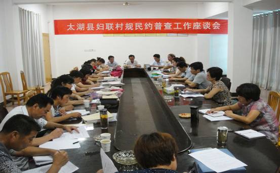 7月29日至8月20日,太湖县妇联联合民政、农委部门工作人员深入全县15个乡镇,通过召开座谈会、发放调查问卷、实地查看等形式,对全县184个村(居)现有的村规民约相关情况进行一次全面普查,重点了解了村规民约中涉及妇女权益保障的相关部分,并收集了各村村规民约复印件,为下一步查找问题,明确修订完善重点打下了坚实的基础。