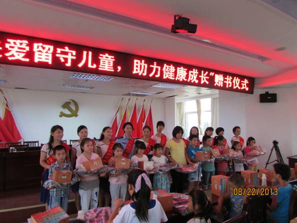 然后举行了“关爱留守儿童,助力健康成长”赠书仪式。县妇联领导及志愿者们向留守儿童赠送了书包和图书。这些图书不仅能拓展他们的视野、增长知识,也让他们一个人在家的时候有书为伴。