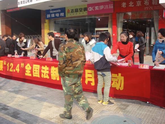 为深入贯彻落实党的十八届三中全会精神,全面实施“六五”普法规划,在第13个全国法制宣传日到来之际,太湖县妇联联合司法局、安监局等单位,开展以“大力弘扬法治精神,共筑伟大中国梦”为主题的12.4法制宣传活动。活动设置了发放宣传资料、有奖小问答以及现场法律咨询等环节。
