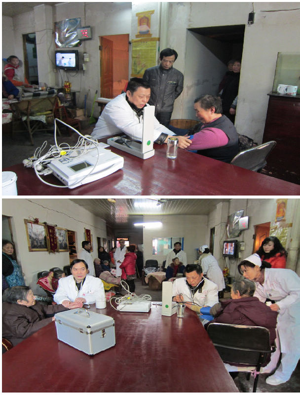 社区妇联主席与三院爱心人士一行十几人来到沿江社区爱心养老院,在爱心养老院院长方金梅女士的安排下,医生们为住院老人进行了免费问诊、测量血压、测心电图等服务,并为一些需要药品治疗的老人送上免费药品。