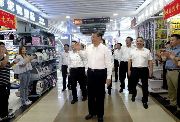 随后,习近平来到义乌国际商贸城考察。他通过电子屏幕实时了解商贸城运营及“义新欧”班列运行情况,并走进市场同商户、小企业主代表亲切交流,详细询问市场行情。他强调,义乌小商品闯出了大市场、做成了大产业,走到这一步很了不起,每个人都是参与者、建设者、贡献者。商贸城要再创新辉煌,为拓展国内国际市场、畅通国内国际双循环作出更大贡献。
