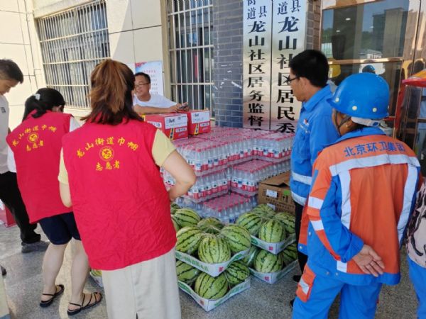 在龙山社区,巾帼志愿者们将环卫工人迎到社区驿站,请他们歇歇脚、纳纳凉,将矿泉水、香甜解暑的西瓜送到他们手中,与他们暖心交谈,感谢环卫工人在高温下坚守岗位、任劳任怨,不畏酷暑、坚持奋战。工作人员还叮嘱大家要合理安排作息时间,高温工作时做好防暑降温工作,增强安全防护意识。