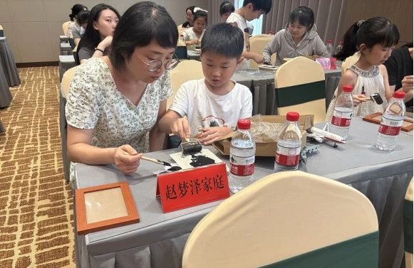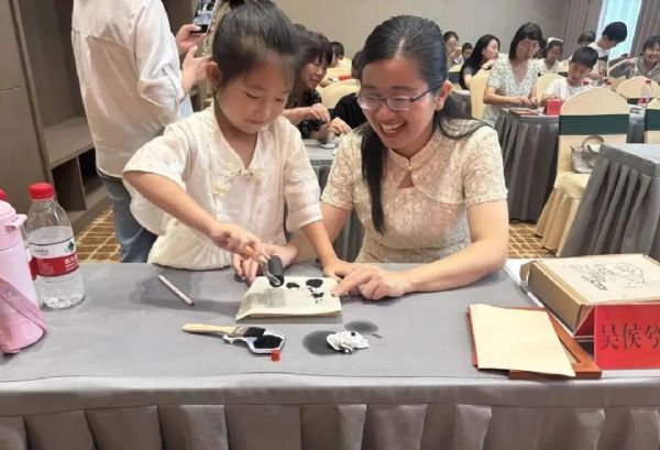 “亲子互动手工”环节将活动氛围推向高潮。在专业手工老师的现场指导下,家长和孩子们一同参与雕版拓印手工制作。安全环保的材料、轻松愉快的氛围,为亲子间的协作与沟通搭建了一座温馨的桥梁。家长们耐心引导,孩子们积极动手,每一次尝试都是探索未知的旅程,每一次交流都是心灵的亲密碰撞,让亲子关系在互动中更加紧密,情感更加深厚,现场洋溢着欢声笑语。